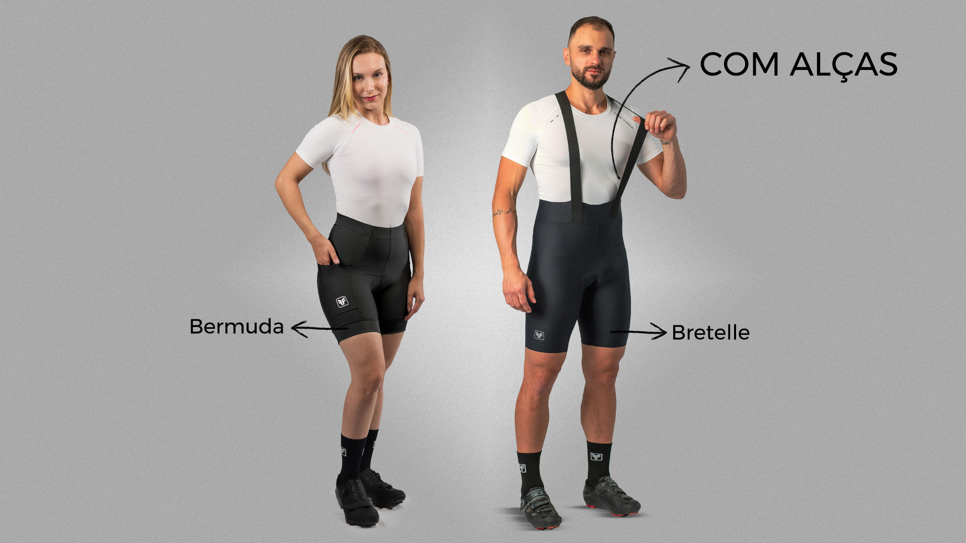 A principal diferença é a presença das alças no bretelle. Elas garantem que a bermuda fique no lugar, oferecendo mais conforto e evitando que ela escorregue durante o pedal.