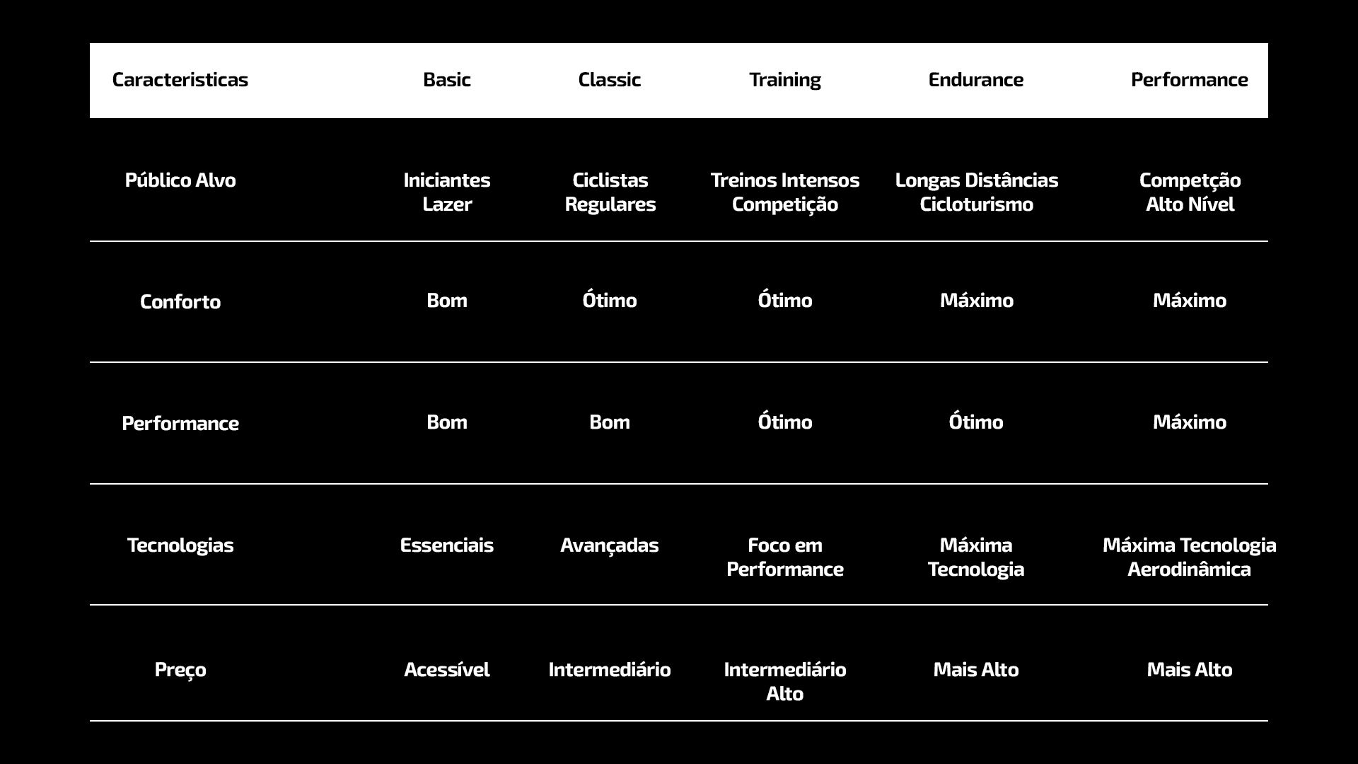 Linha Classic:Perfeita para ciclistas que pedalam regularmente e buscam um equilíbrio entre conforto e estilo.