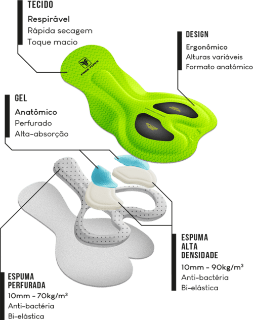 Sua modelagem ergonômica, isto é, corte e costura em formato curvado no mesmo ângulo em que o ciclista se posiciona sobre a bike - ao contrário do corte reto usado pelo mercado em geral - garante mais mobilidade e conforto, resultando em um perceptível aumento do desempenho durante as pedaladas.