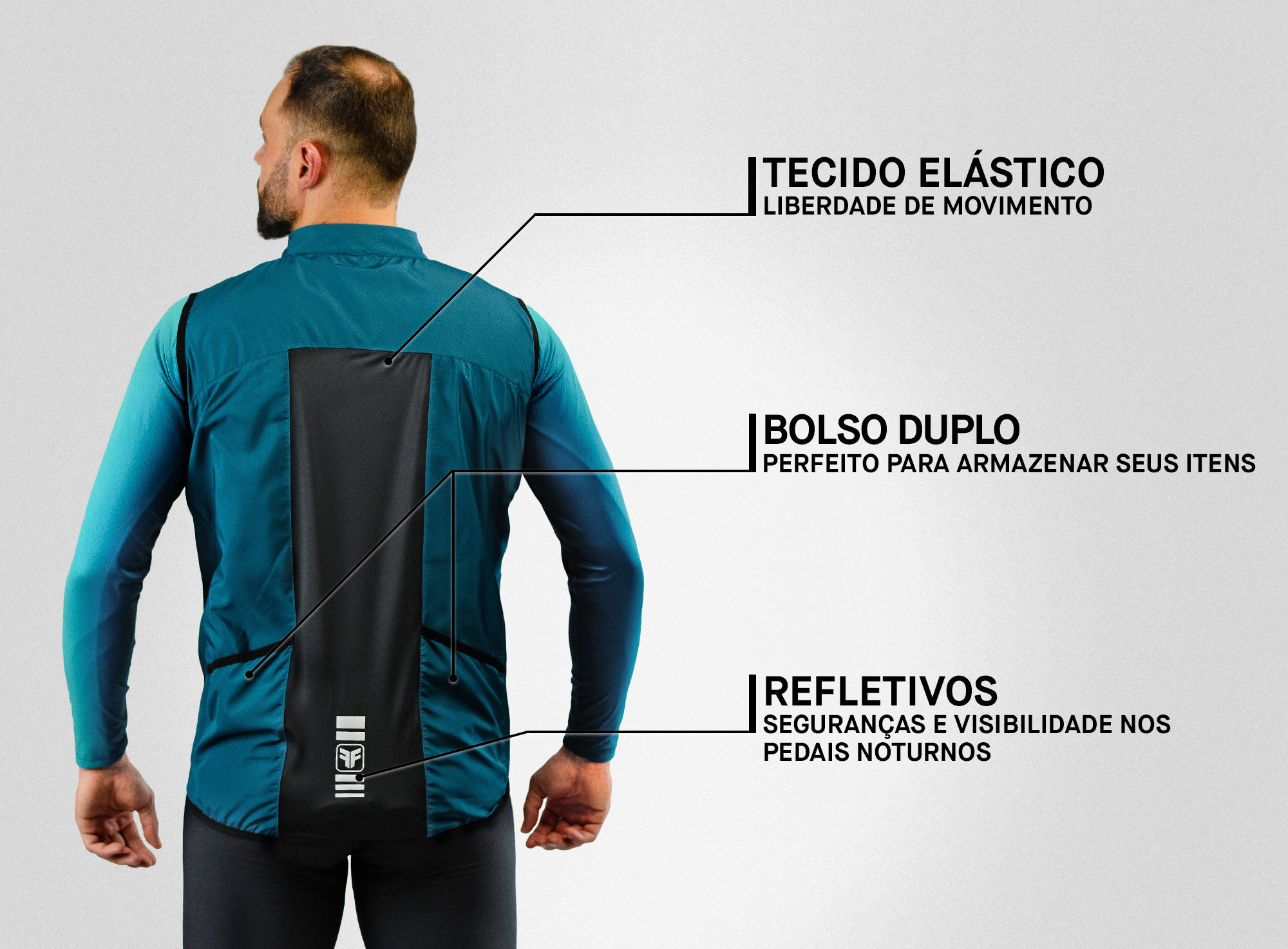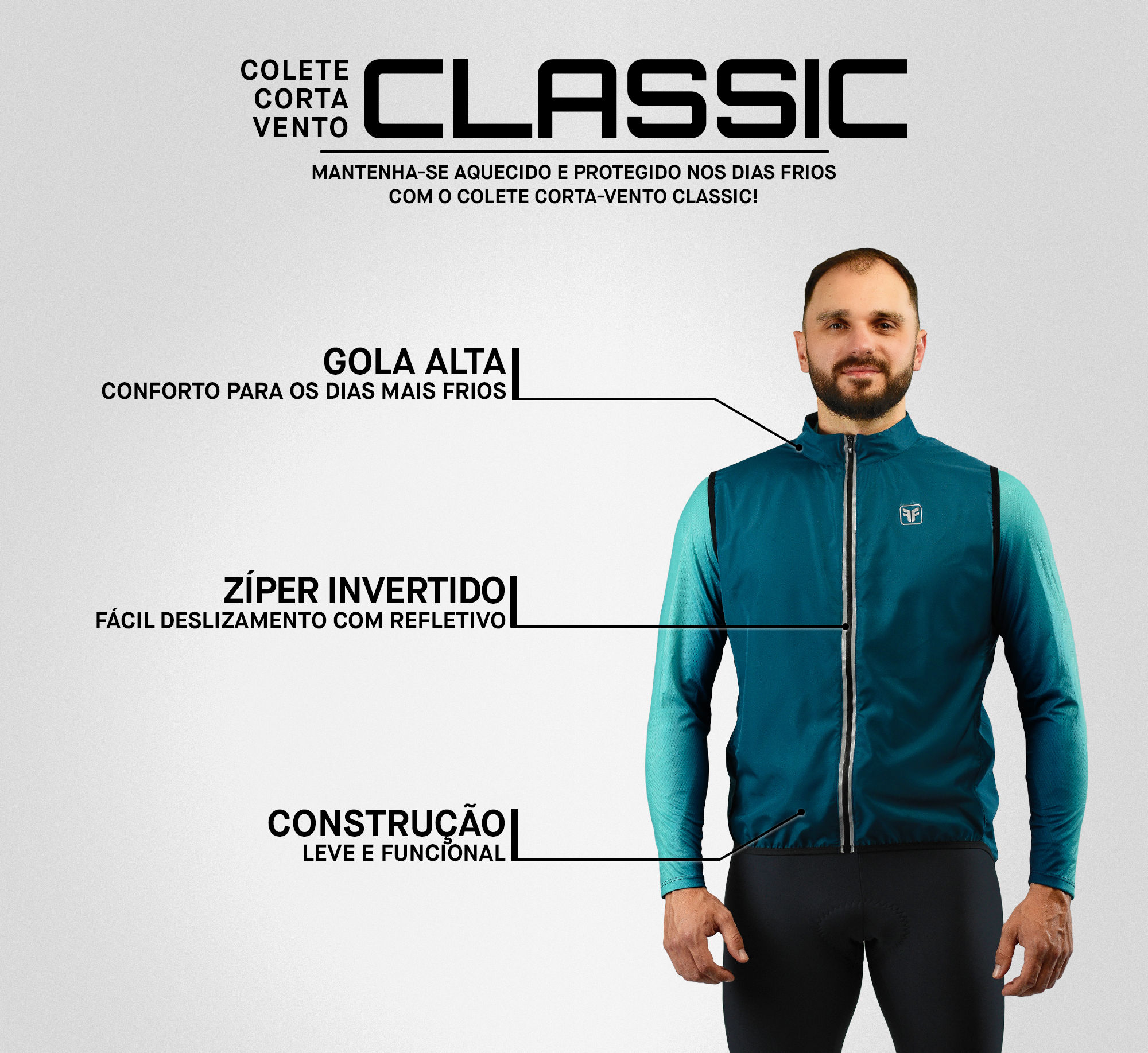 | Características | O colete corta vento classic conta com um zíper invertido de fácil deslizamento e refletivos tanto na parte de trás quanto da frente, proporcionando mais proteção e visibilidade ao pedalar à noite. |